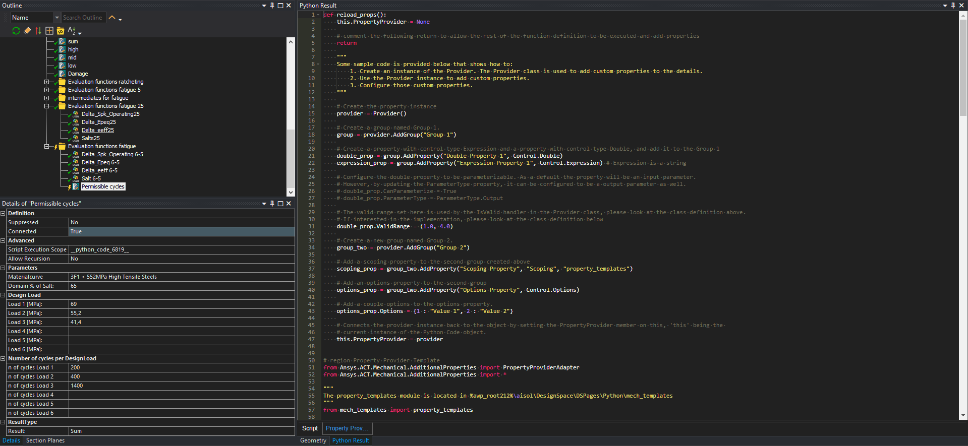 But when I run my file, I get a Python Result that has the right script behind it, But it shows the standard property provider. However I do have the option to change parameters in the "Details of 'Python Result'" tab.