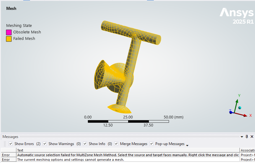 When you have a failed mesh, there is a message "Automatic source selection failed for MultiZone Mesh Method. Select the source and target faces manually. Right click the message and click Show Problematic Geometry to view the face(s) selected automatically."